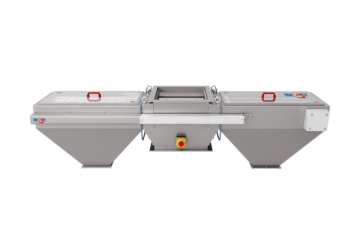 Magnetisk separator med automatisk rensning tjener til separation af magnetiske metalurenheder. Standard tilbydes to typer: indgangsstørrelse 250x250, 400x400 a 500x500 med kapacitet til 150 t/time.