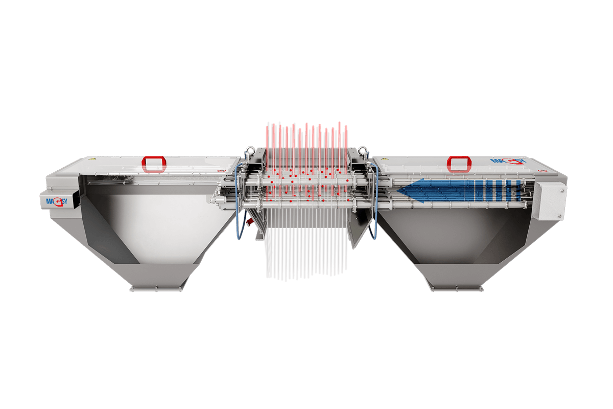 Princippet af den automatiske rensning består i det, at materialet kommer gennem midterdel af den magnetiske separator og altid efter indstillet interval er opfangede metalurenheder båret til venstre eller højre kavitet (se animation nedenunder). Stor fordel er, at i tilfælde af rensning behøves ikke at afbryde materialeflowet.